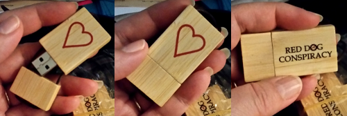 This USB flash drive is made with real bamboo, then stamped with the Red Dog Conspiracy logo on one side and the Hart Family symbol on the other.